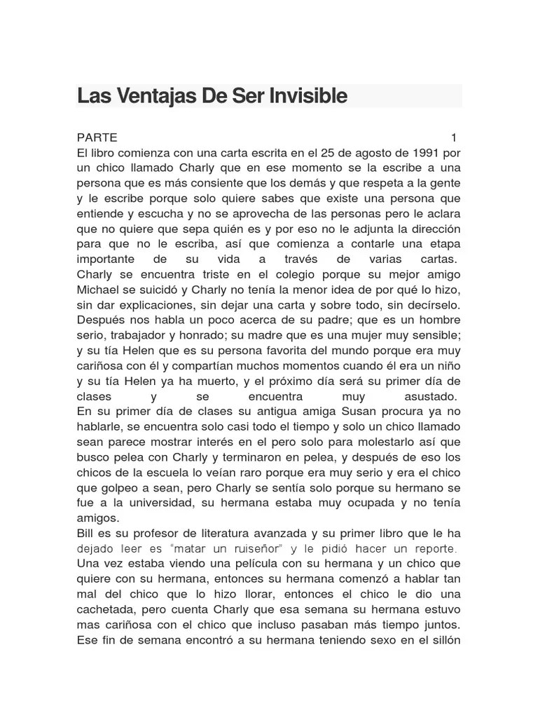 Lee muchísimo, no sale con amigos ni con chicas y reflexiona sobre el mundo desde un punto de vista muy particular. Resumen del libro las ventajas de ser invisible, es una obra literaria que se basa en acontecimientos que envuelven a los adolescentes, que durante su .